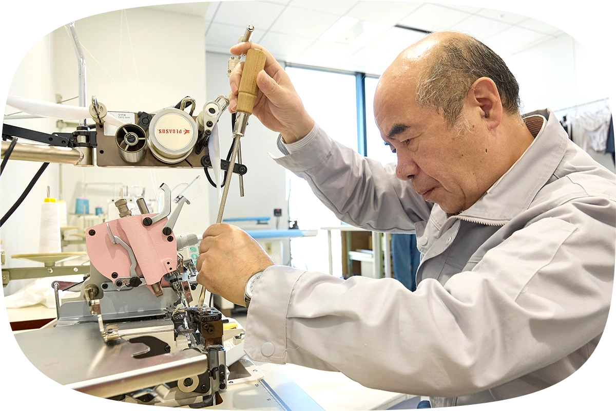 海外工場のスタッフ向けに国内工場での長期研修を実施し、100年以上培われてきた技術やものづくりの姿勢を伝承しています。高機能インナーや複雑な縫製仕様の製品も、海外工場でも安定的に生産できる体制が整っています。